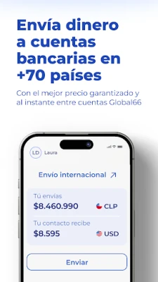 Global66 لا يقتصر على الاستقبال فحسب، بل يتيح لك أيضاً إرسال الأموال إلى أكثر من 70 دولة حول العالم، مع وصول التحويلات في غضون دقائق معدودة إلى أوروبا و20 دولة أخرى. استفد من تحويلات فورية بين أكثر من مليوني مستخدم لـ Global66. وتمتع بمرونة لا تضاهى في الدفع عالمياً باستخدام بطاقة Smart Card الذكية الخاصة بك، سواء كانت مادية أو رقمية، دون القلق بشأن رسوم الصرف الأجنبي أو العمولات الخفية. هذه البطاقة المصممة للمسافرين وأي شخص يحتاج للدفع عالمياً توفر لك راحة البال، وتخلو من رسوم الصيانة عند استخدامها مرة واحدة شهرياً على الأقل. وفي بعض المناطق مثل البرازيل والأرجنتين، يمكنك الدفع بسهولة عبر مسح رموز QR، مما يجعل معاملاتك اليومية أكثر سلاسة.