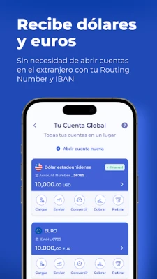 افتح حسابك العالمي بسهولة وبتكلفة صفرية، متاحًا بالبيزو، الدولار، أو اليورو. ابدأ تجربتك المالية الميسرة في أقل من 5 دقائق، واستمتع بإدارة أموالك الدولية بكفاءة.