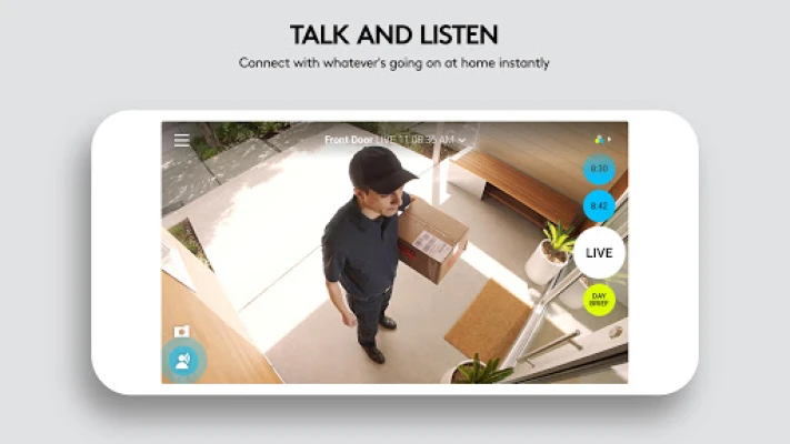 بمجرد ربط Circle بشبكة Wi-Fi المنزلية، ستتحول شاشتك إلى نافذة حية على عالمك. يتيح لك تطبيق Circle المبتكر بثًا مباشرًا وتنزيلات غير محدودة لمقاطع الفيديو بسلاسة تامة. لم تعد بحاجة للقلق؛ فبفضل التنبيهات الذكية التي ترسل لقطات مرئية فورية إلى جهازك عند اكتشاف أي حركة غير متوقعة، ستكون دائمًا على اطلاع. شاهد الأحداث بدقة 1080p HD في الوقت الفعلي أو احفظها وأعد تشغيلها لاحقًا لتراجع اللحظات الهامة، حتى دون فتح التطبيق في كل مرة بفضل لقطات الإخطار. كما يمكنك التحدث والاستماع عبر الكاميرا، مما يتيح لك التواصل مع أفراد عائلتك أو حتى ساعي البريد.