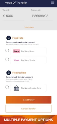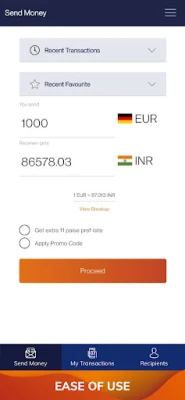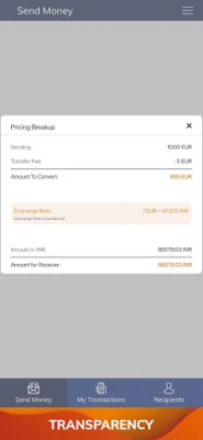 استمتع بتجربة تطبيق جوال سلسة وبديهية، تمكنك من إدارة تحويلاتك المالية أينما كنت. تضمن منصتنا المتقدمة تكاليف تحويل منخفضة للغاية، مقرونة بإجراءات أمنية صارمة لتحافظ على أموالك محمية دائمًا. ولتبسيط تجربتك، نقدم خدمة التحقق من الهوية (KYC) عبر الفيديو عبر الإنترنت، سريعة ومباشرة، مما يفتح لك الباب لتحويل الأموال من أي بنك في أوروبا إلى أي بنك في الهند بكل مرونة.